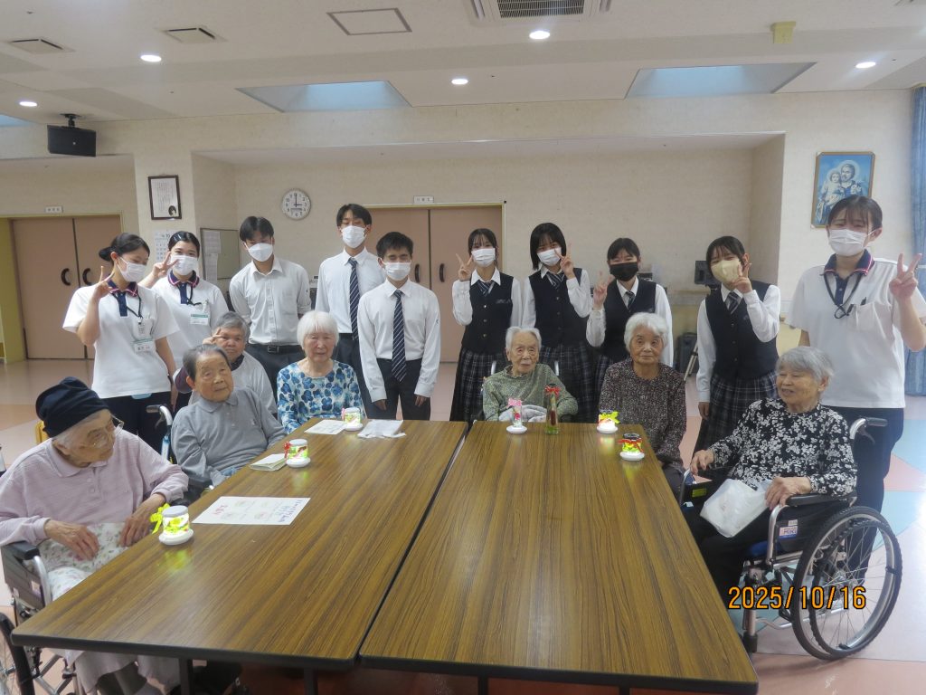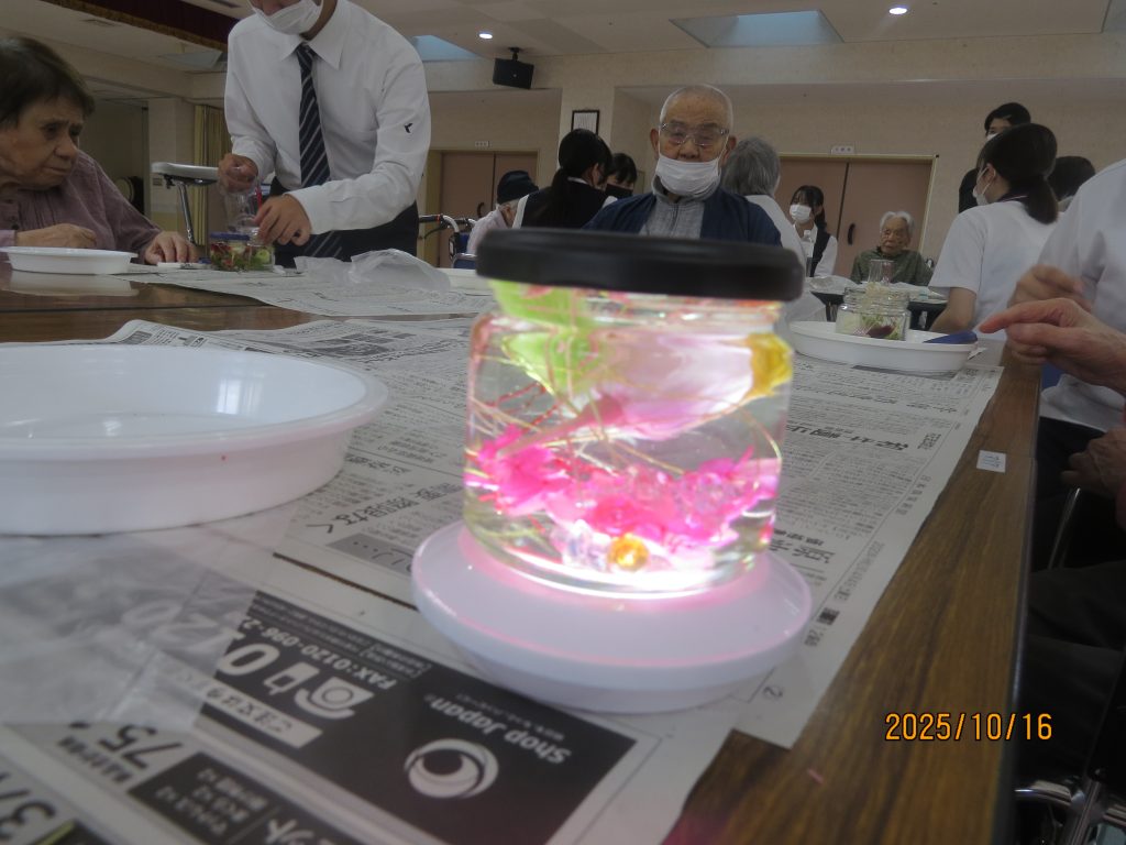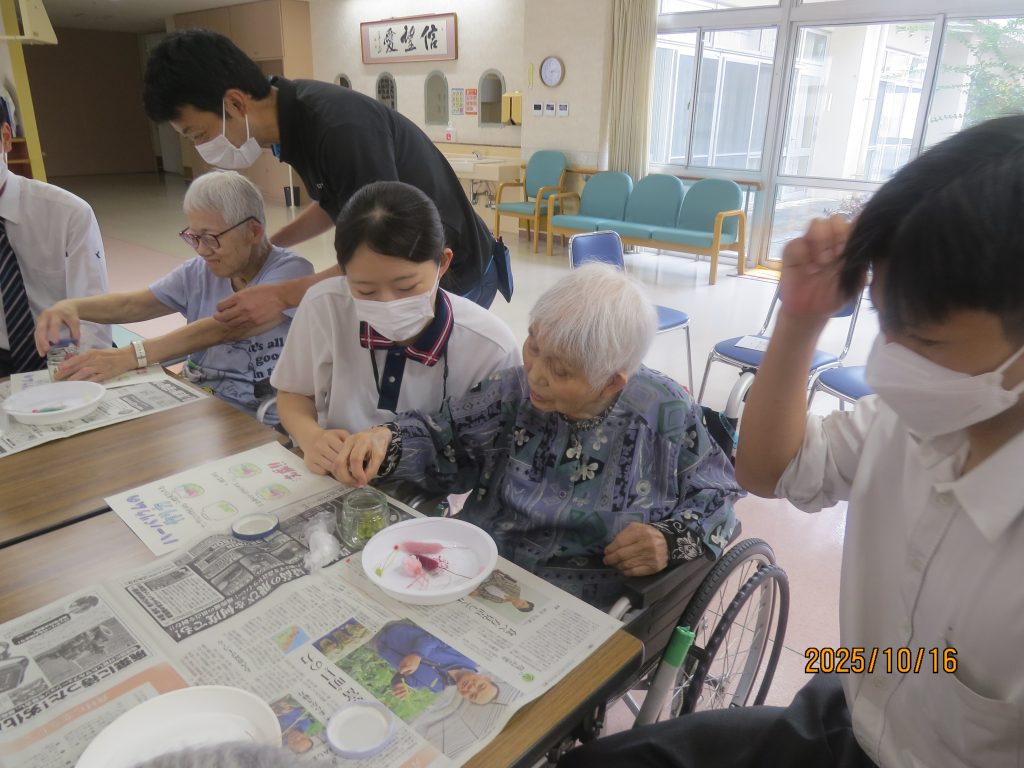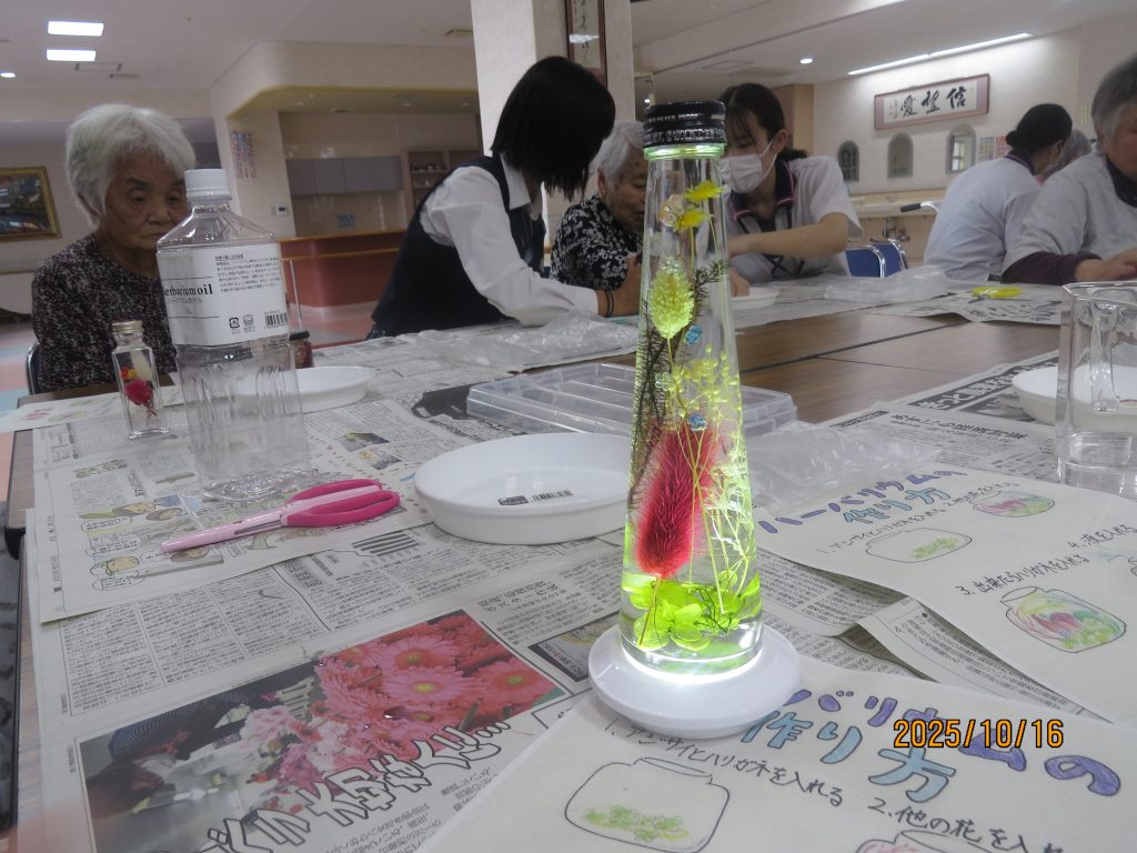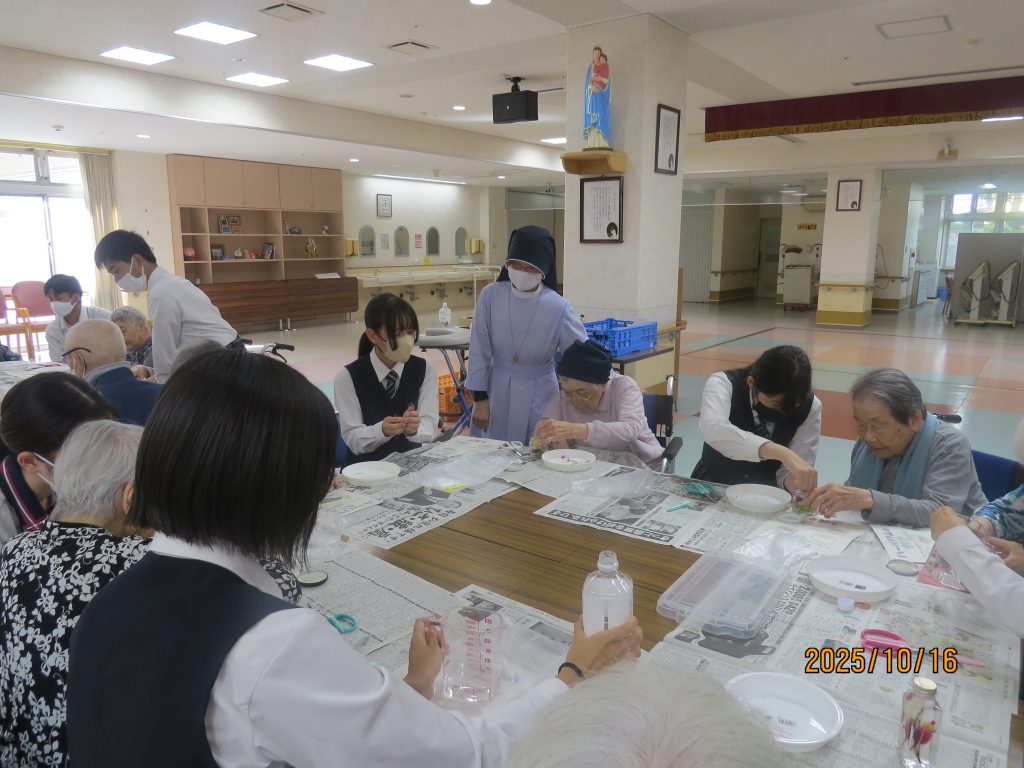 令和7年10月16(木)特別養護老人ホームに高志館高校の学生が来園され、ご利用者に「ハーバリウム」の作り方を教えて下さいました。
